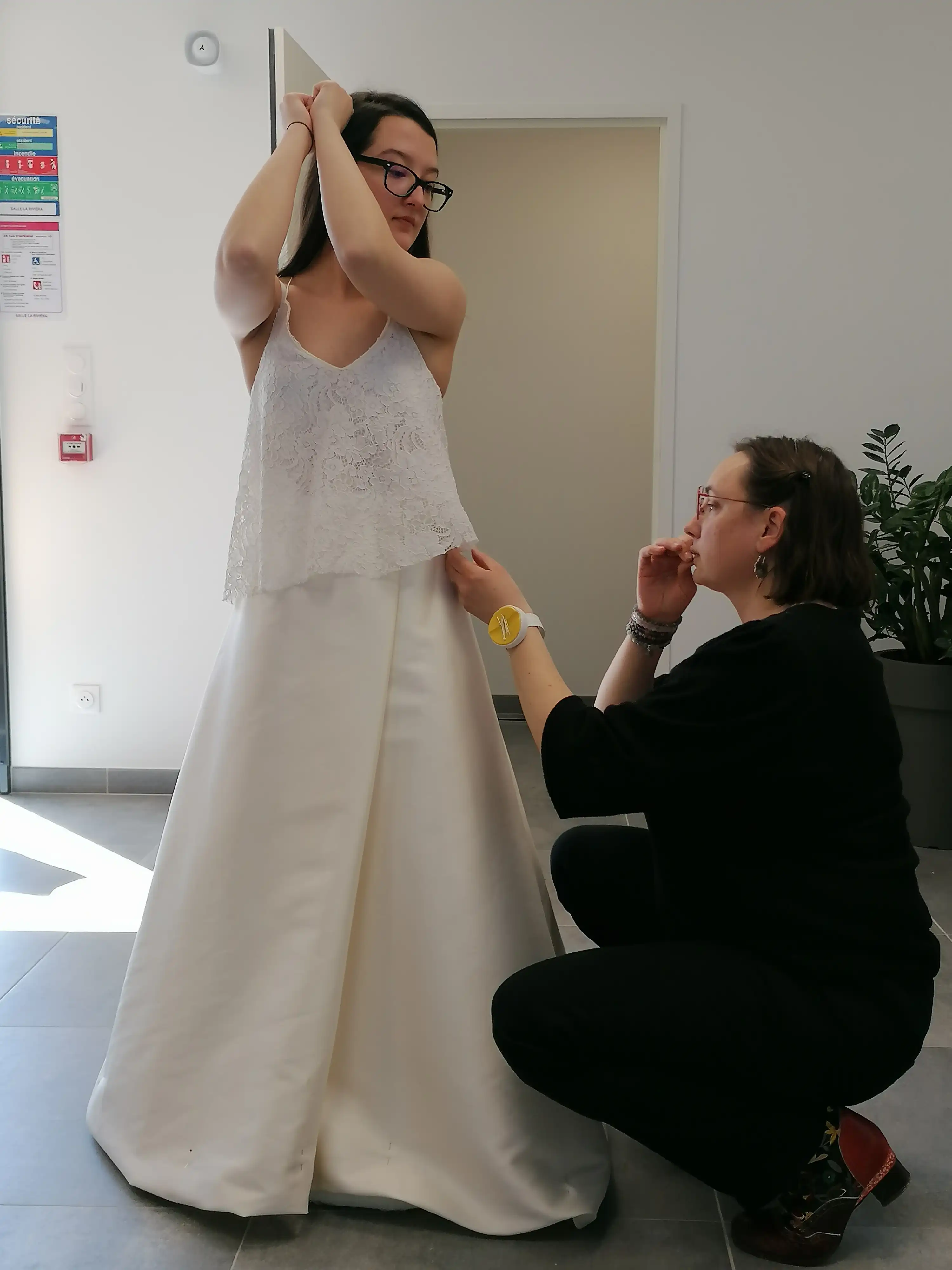 Un essayage qui magnifie tous les choix faits et qui vous mettra en valeur. une pose d’épingles pour l’ourlet de la robe…